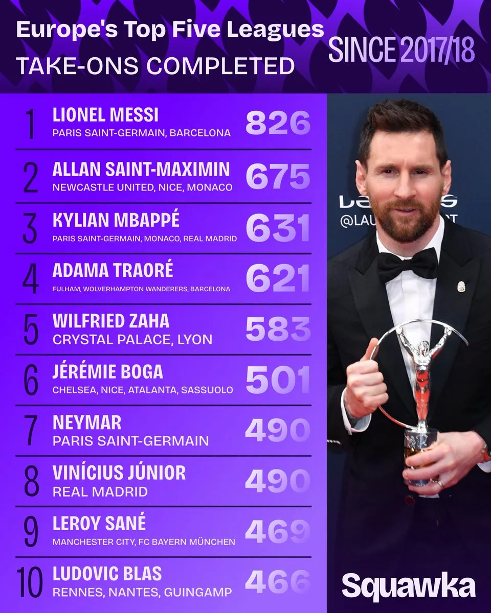 ac米兰-近9季五大联赛总过人榜:梅西居首,圣马、姆巴佩在列