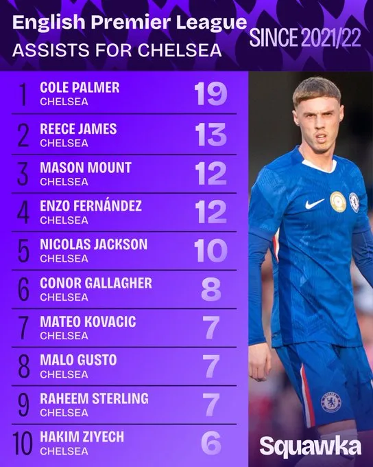 虎扑09月06日讯 据Squawka数据统计,自21/22赛季,在切尔西球员(包含曾经效力)英超助攻榜中,帕尔默19次居首,里斯-詹姆斯13次排名第二。